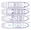 Главная палуба — 4 каюты для гостей — просторный салон с телевизором, CD/DVD-проигрывателем — дайв-дек (дайв-платформа, душ и туалет, зарядные станции, 40 х алюминевых 12-литровых баллона)