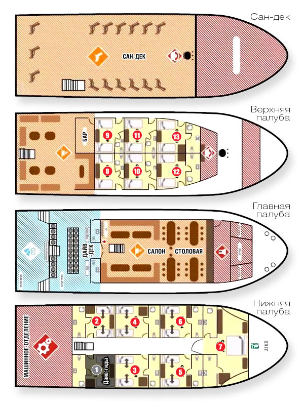 Навигация и связь: DSC, VHF-радио, GPS, EPIRB, спутниковый телефон Каюты: Нижняя палуба: Главная полуба: Верхняя палуба: Вторая верхняя палуба: План яхты В стоимость сафари включено: групповой трансфер; двухместное размещение в каютах; 3-разовое питание по системе «шведский стол» и закуски в течение дня и напитки: чай, кофе, фруктовые соки и газировка; дайвинг - 18 погружений в неделю, включая ночные погружения, услуги дайв-гида, 12-литровые баллоны, грузы, пояса; парковые и портовые сборы. Не включено: въездная виза; пиво и вино; аренда оборудования, 15-л баллоны, найтрокс; налог VAT (НДС) - 10% от стоимости сафари, оплачивается на борту; дайв-страховка; чаевые команде и др. персональные расходы. |