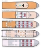- 6 кают Twin с двумя кроватями на одном уровне на нижней палубе - 6 кают Twin с двумя кроватями на одном уровне на верхней палубе - 2 каюты Panoramic Master Suite с двуспальными кроватями на верхней палубе - 4 каюты Master Suite с двуспальными кроватями на второй верхней палубе