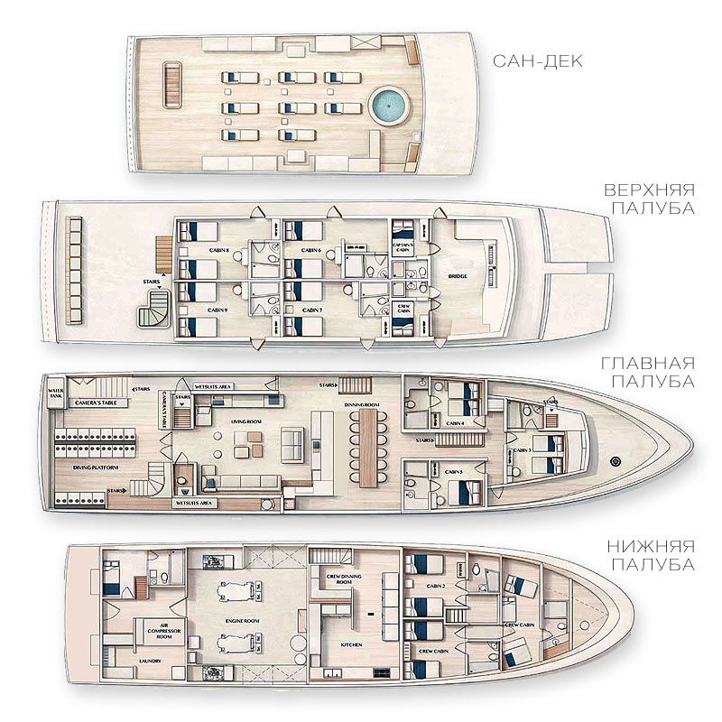 Навигация и связь: VHF/DSC/SSB-радио, радар, компас, эхосонар, GPS, спутниковый телефон Каюты: гости размещаются в 8 каютах: В каждой каюте: регулируемый кондиционер, ванная комната с душем, фен, места для хранения личных вещей, сейф. Нижняя палуба: Главная палуба: Верхняя палуба: Вторая верхняя палуба: План яхты Стоимость дайв-сафари на яхте Galaxy Diver III, US$ с человека