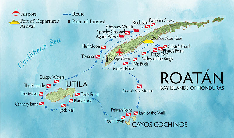 Дайвинг-сафари на островах Ислас-де-ла-Баия (исп. Islas de la Bahía), Гондурас. Начало и окончание тура на острове Роатан (Roatan). Основные дайв-сайты у островов Роатан, Утила и Кочинос.