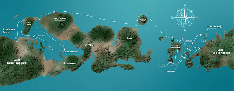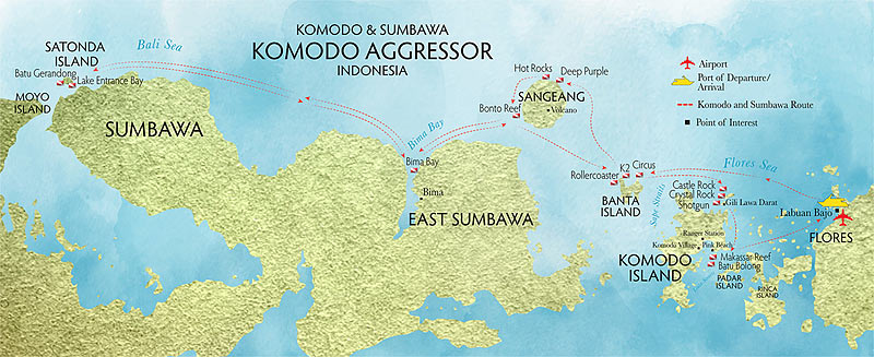 Начало сафари по маршруту «Sumbawa – Komodo» из порта г. Bima, либо из порта Sumbawa Besar, что на острове Сумбава (Sumbawa). Добраться сюда можно за 1 час самолетом с о. Бали (Bali). Окончание в порту Labuan Bajo на острове Флорес (Flores). Либо в обратном направлении.