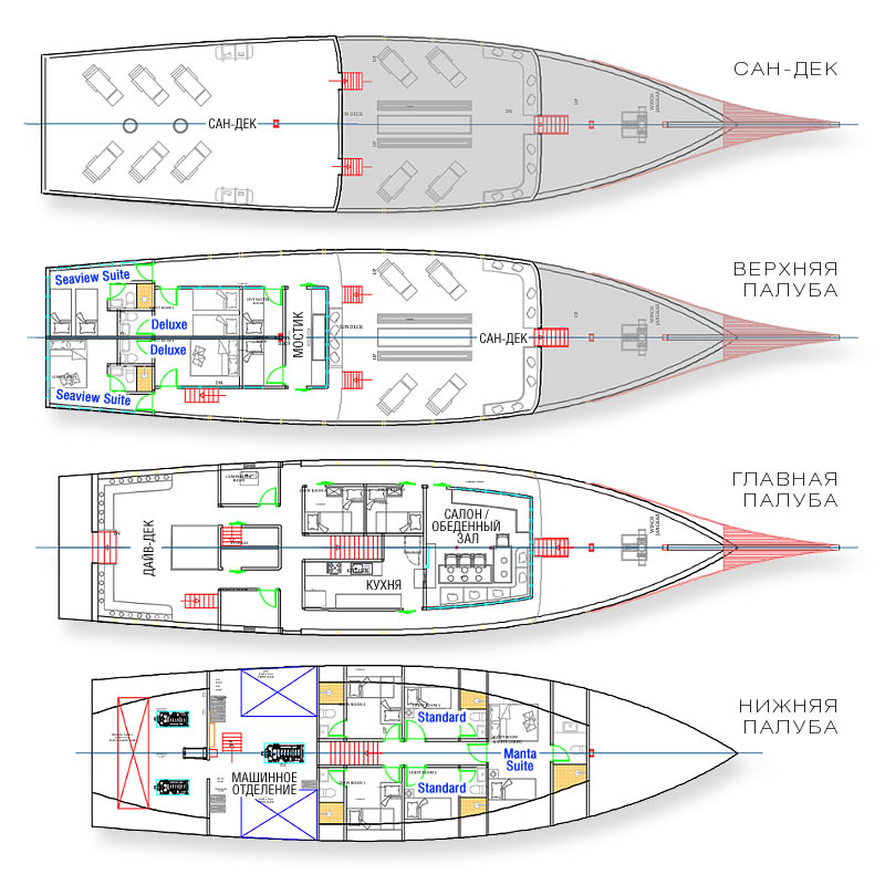 На главной палубе - обеденный зал/салон с телевизором, DVD-плеером и аудио-системой - кухня - дайв-дек - каюты экипажа