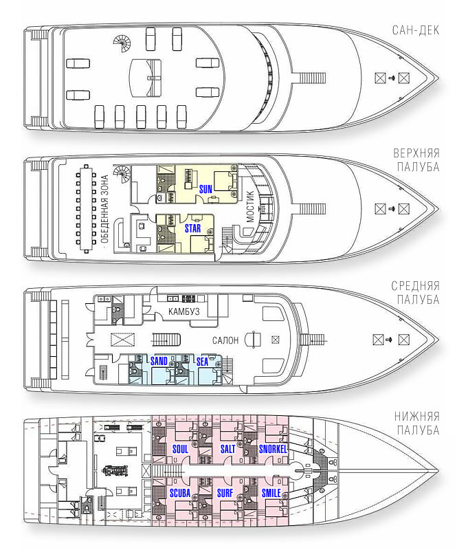 Навигация и связь: GPS, GSM, VHF-радио, эхолот, Интернет Каюты: гости размещаются в 10 каютах следующих категорий: Нижняя палуба Средняя палуба Верхняя палуба Вторая верхняя палуба Все погружения осуществляются с дони. Дони — дайв-бот, сопровождающий яхту, на котором находится все оборудование для дайвинга, компрессор, баллоны (11,5- и 13,5-литровые DIN/INT); на дайв-боте есть сидячие места для всех дайверов, место для опреснения снаряжения, душ. Такое разделение на основное судно и дайв-бот не только освобождает пространство на яхте, но и помогает в организации погружений, поскольку все снаряжение находится в одном месте, а устойчивость и низкая посадка дони упрощают погружения с её дайв-платформы. Для участия в сафари на яхте Carpe Diem необходимо иметь дайверский сертификат AOWD или OWD с минимум 100 погружениями. Заселение на яхту в день начала сафари около 12:30. В день окончания сафари гости покидают яхту не позднее 8:00. План яхты Цена дайв-сафари на яхте Carpe Diem, с человека (маршруты дайв-сафари: Ari Atoll или Baa/Raa Atoll):
