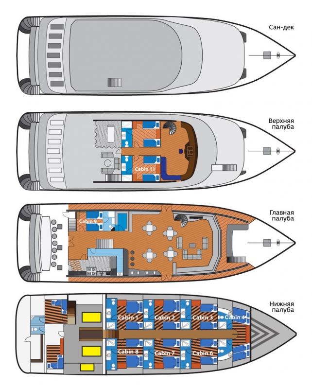 Все кровати расположены на одном уровне, нет двухъярусных кроватей. Ресторан. Столовая расположена на открытой веранде в кормовой части основной палубы. Территория ресторана полностью затенена и защищена на случай дождя. Блюда сервируются на столах и включают блюда итальянской и мальдивской кухни. Главным образом из свежей рыбы, но шеф-повар готов удовлетворить любые специфические требования гостей. Раз в неделю сервируется шведский стол из блюд традиционной мальдивской кухни. Кают-компания. Большой закрытый кондиционированый салон с баром, в котором широкий выбор прохладительных и спиртных напитков. Салон оборудован диванами из ротанга и TV-DVD стерео-системой. Вся мебель на яхте изготовлена из ценных мальдивских пород дерева, что придаёт интерьерам особый колорит. Палубы. Открытые и затенённые веранды расположены на трёх палубах и оборудованы шезлонгами и лежаками. Здесь гости могут насладиться захватывающими видами Мальдивских островов. Интернет и связь. Подключение к интернету доступно за отдельную плату. В каждой каюте гости найдут мальдивскую сим-карту, которой они могут пользоваться, если ещё не успели обзавестись своей. Также гости могут пользоваться мобильным телефоном яхты. Его номер и адрес электроной почты яхты можно получить при бронировании сафари. Аренда оборудования для дайвинга. Оборудование для дайвинга можно арендовать на яхте, но заявку необходимо сделать во время бронирования. Спа-салон и массаж. На борту имеется спа-салон, специализирующийся на аюрведических процедурах и массаже. Проводятся аюрведические недели со специальной программой. Магазин. Также на яхте работает небольшой магазин, предлагающий традиционные мальдивские сувениры, фирменные футболки и разнообразные гаджеты. План палуб яхты * Для комфорта пассажиров и оптимизации пространства на яхте все оборудование для дайвинга находится на дайв-боте, сопровождающем яхту. На Мальдивах такие дайв-боты называются дони (dhoni). Такое разделение на основное судно и дайв-бот делает яхту просторней и в то же время помогает в организации погружений, поскольку все снаряжение находится в одном месте, а устойчивость и низкая посадка дони делает погружения с её дайв-платформы более удобными. Цена дайв-сафари на яхте Conte Max, USD с человека