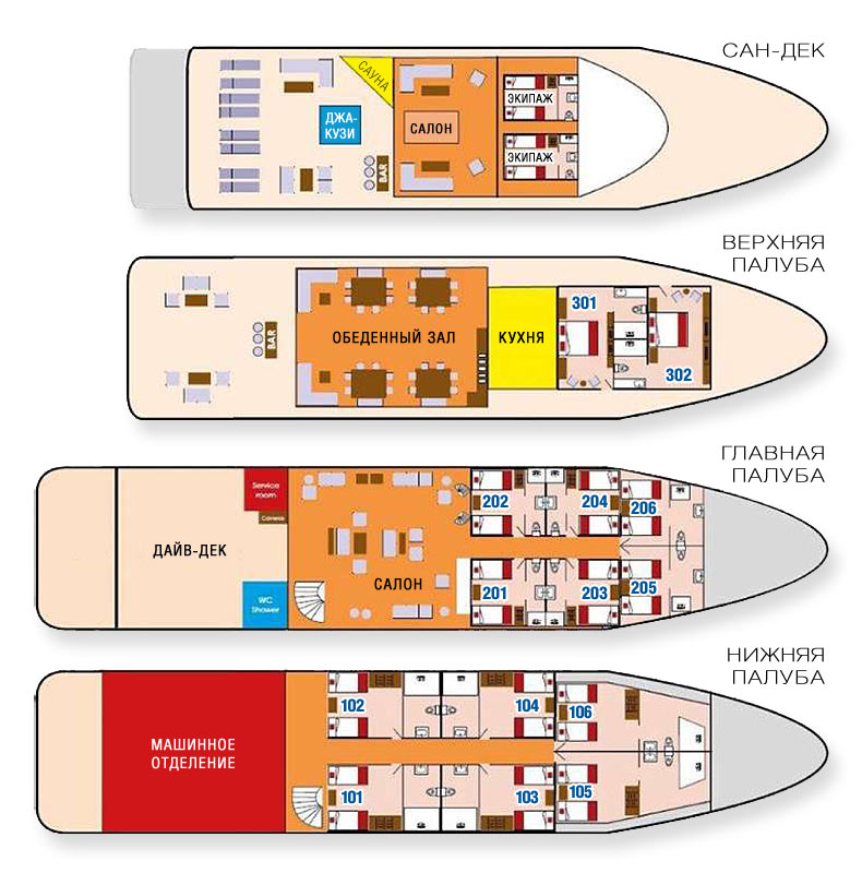 Кровати во всех каютах на одном уровне, в каждой каюте есть ванная комната с душем, регулируемый кондиционер, телевизор, сейф.